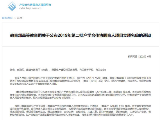 近日,教育部高等教育司公布了2019年第二批产学合作协同育人项目立项名单,我院获批五项。