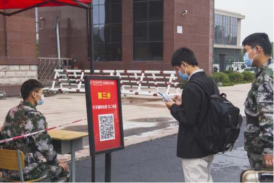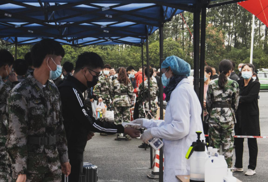 为了提高防疫工作效率,校门通道入口设有红外测温仪,经过测体温和行李消毒后方可进入校园。通道外设置了留观区,校医务室还在报到区设置了防疫应急处理点。