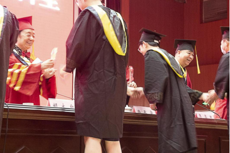 在全场的热烈掌声中,与会领导亲自为毕业生代表正冠拨苏、颁发学士学位证书,并为2021届考取硕士研究生的学生颁发纪念奖杯。