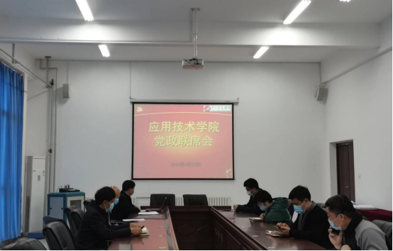4月22日,应用技术学院在行政楼会议室召开党政联席会,副校长冯长安、院党委书记张丕万、院长陈传举,学院各部门中层领导以及相关工作人员参加了会议。