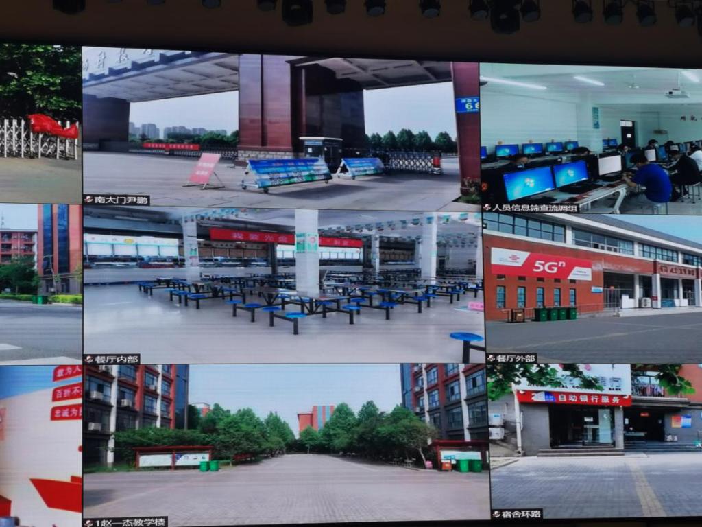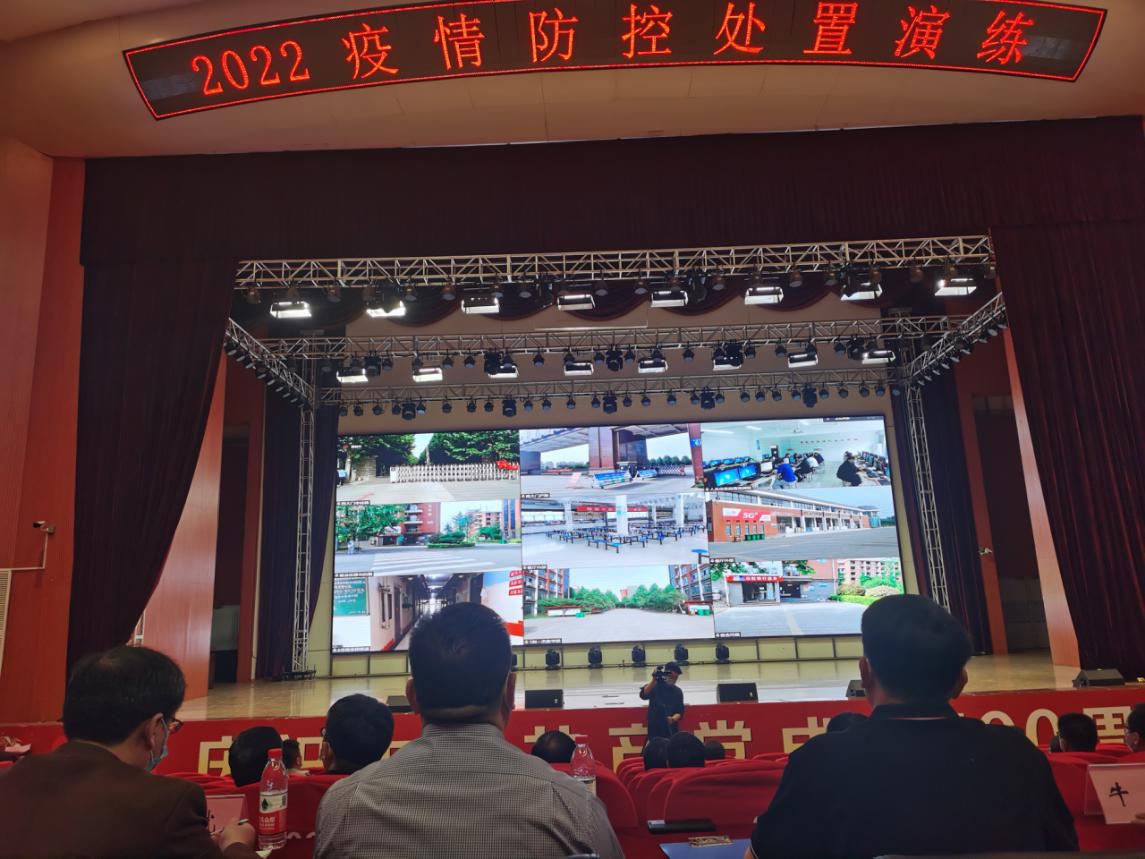 本次演练设置应急启动、人员信息筛查、校园封控、区域管控、隔离转运、流调溯源、防控消杀等环节,师生活动中心报告厅设立指挥中心,通过监控摄像头连接LED大屏,全景展示校园突发疫情应急处置的各个环节。本次演练整体紧张有序,指挥体系通畅,人员到岗迅速,协同配合高效,达到了演练的预期目标。